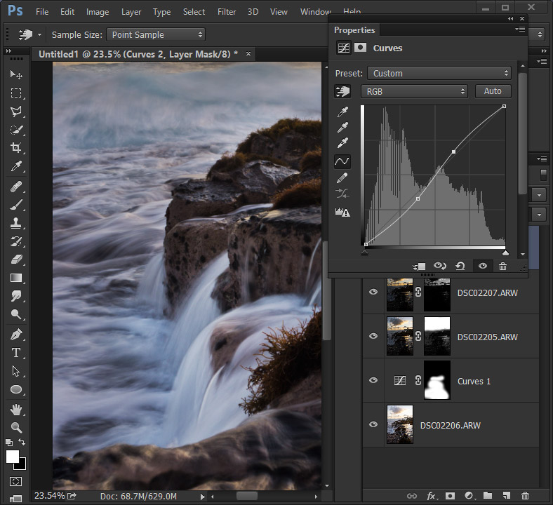 To increase the contrast of the waterfall, I created a curves adjustment above all the layers. I used the pick tool to select a dark part and a bright part of the water. This created anchor points in the curve at the tonal points I chose. I created an S curve to increase the contrast.